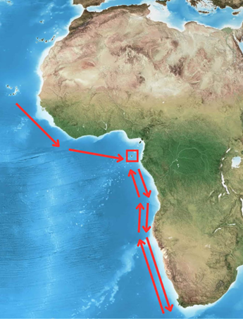 The expedition set sail from Cabo Verde, along the west coast of Africa, and travel through the Gulf of Guinea to the islands of São Tomé and Príncipe, where approximately four months of research will be focusing on the Southern Hemisphere humpback whales that gather in the region to breed. Following this first phase, the expedition will continue southwards following the migration route of the humpback whales towards their feeding grounds. Along the coast of Angola and Namibia with potential stops for additional in-depth surveys.The transect continues southward to South Africa, completing its course. Finally, the team will sail back north from South Africa to São Tomé and Príncipe, coinciding with the humpback whales’ return to their breeding ground. Tracing the coast of Namibia and Angola again, with potential stops for in-depth surveys. The expedition will then continue with approximately four months of research in the waters around São Tomé and Príncipe.